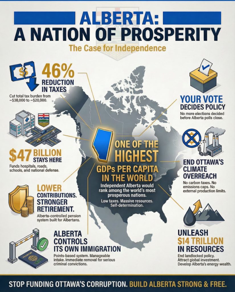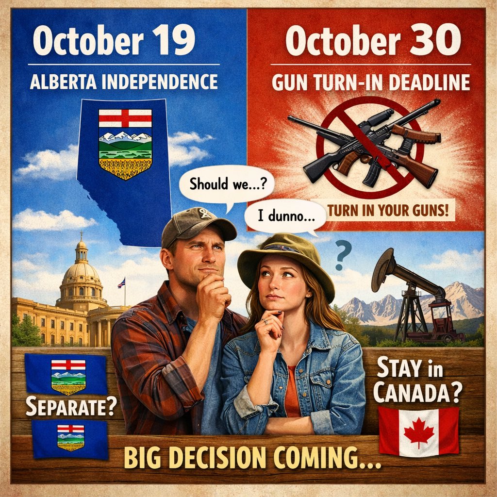 Premier (governor) of the province, Danielle Smith said that the independence question will be counted first in October. Only if that question is a “NO” do the other nine questions come into play, because if independence passes, it becomes the defining result of the entire referendum. This proves that if it passes, then Smith will work for actual unilateral secession, not use all 10 ballot questions to try to extract concessions from the federal government.