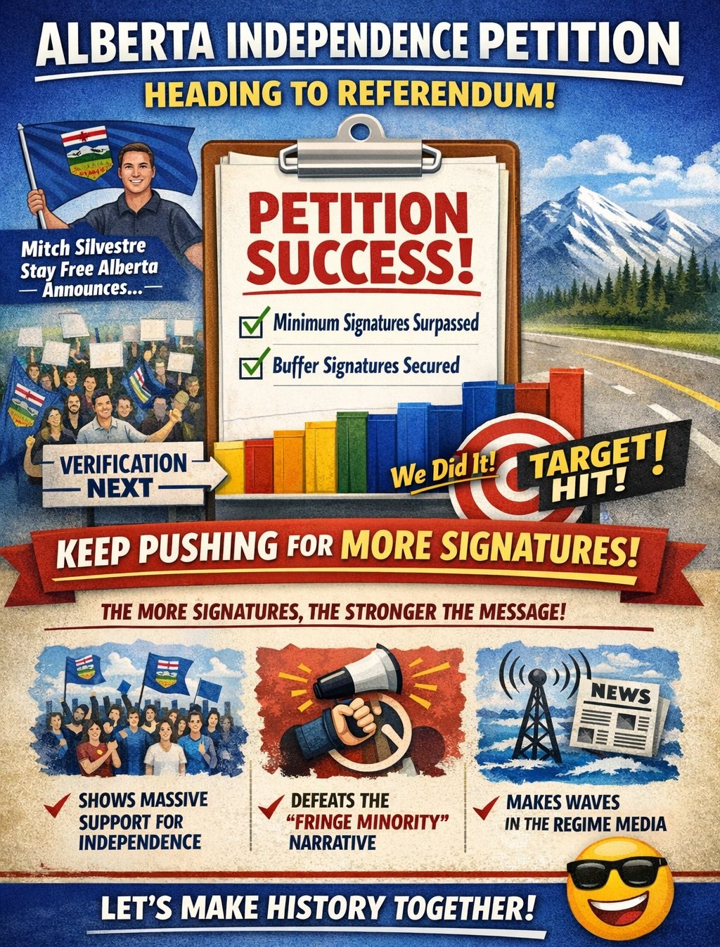 The petition campaign to get Alberta independence on Alberta’s ballot has surpassed the minimum number of signatures required for it to proceed to a referendum. Plus, there’s already enough buffer signatures to make up for any which will be disqualified by Elections Alberta during their review & verification, according to Mitch Silvestre, leader of the campaign. Legally, the campaign is organized by a new shell organization for the petition called Stay Free Alberta, but is indirectly supported by Alberta Prosperity Project, where the money & personnel are.